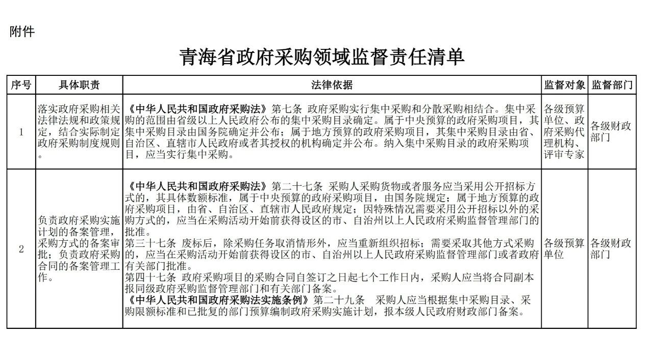 青海省财政厅关于印发《青海省政府采购领域 行政监督责任清单》的通知省直各部门、单位,各市(州)财政局,各政府采购代理机构、 政府采购评审专家: 为深入贯彻《国务院办公厅关于创新完善体制机制推动招标 投标市场规范健康发展的意见》(国办发〔2024〕21号)、《青海 省财政厅关于全面加强政府采购管理工作的通知》(青财采〔2025〕 117 号)要求,推动我省政府采购规范健康发展,根据《中华人 民共和国政府采购法》及其实施条例等相关法律法规和政策要求, 我们研究制定了《青海省政府采购领域行政监督责任清单》,现印 发给你们供参考。 本清单自印发之日起实施,清单内容将根据相关法律、法规、规章和规范性文件的调整进行动态调整。