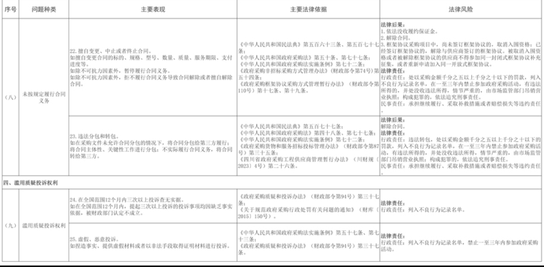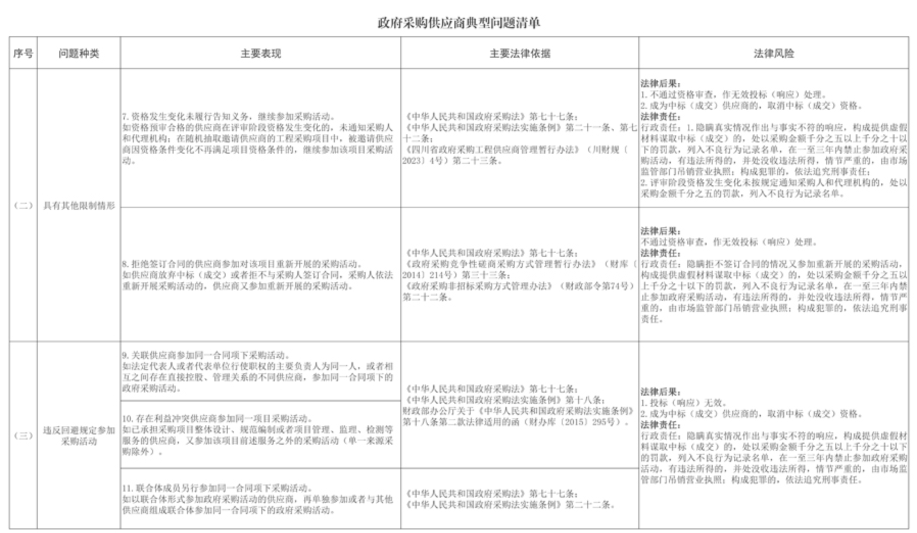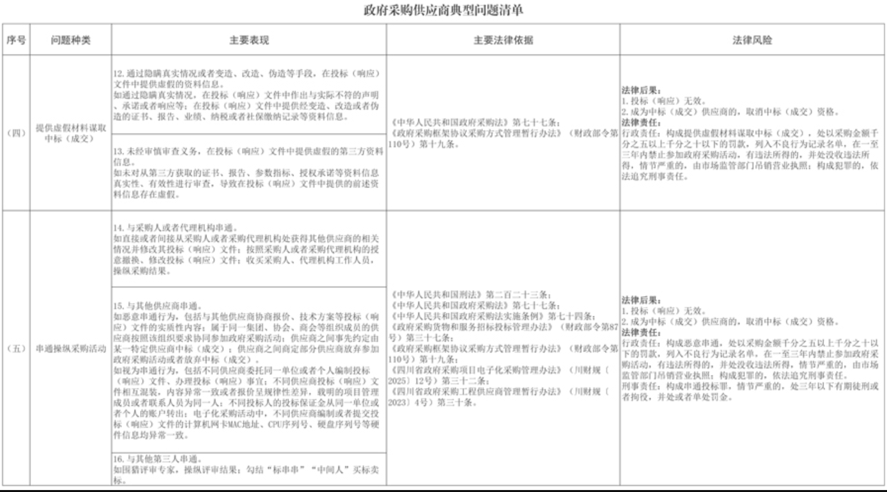 12月22日,四川省财政厅印发《政府采购供应商典型问题清单》(川财采〔2025〕378号),为提高供应商诚信守法意识,营造公平竞争的政府采购市场环境,加大监督执法力度,切实维护政府采购市场秩序。涉及未依法进行投标(响应)、未依法签订政府采购合同、未按规定履行合同义务等6个方面11个问题种类。